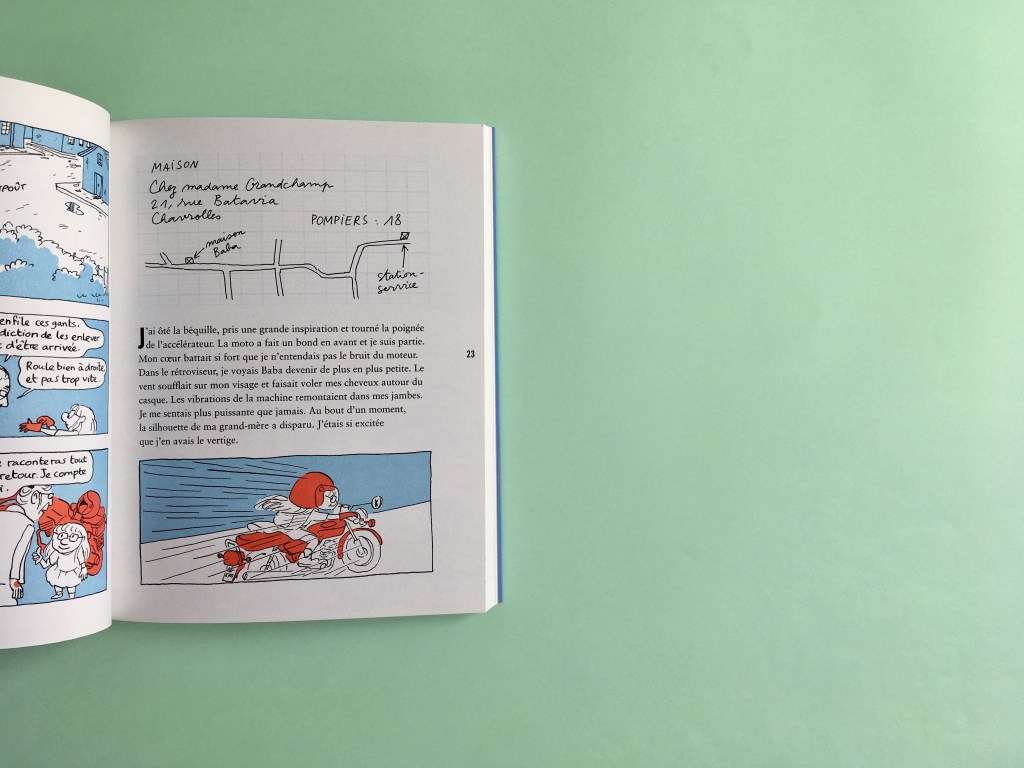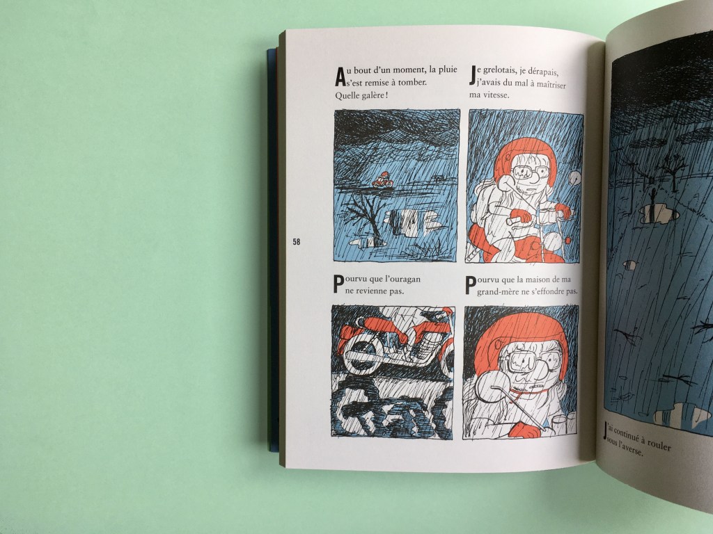 À rebours, l’on comprend également le côté carnet de bord, reportage de la fillette sur sa folle aventure, cela prenant tout son sens dans la forme très intéressante développée par Dorothée de Monfreid dans ce livre alternant paragraphes de textes, saynètes en format bande dessinée ou illustrations de pleine page, cela donnant un rythme particulier et évoluant au fil du récit par certaines pauses ou au contraire certaines envolées de Mari au volant de sa moto. Ce format, qui fonctionne ici particulièrement bien pour tous lecteurs, peut alors également attirer de jeunes lecteurs pour leur permettre d’entrer plus aisément dans la lecture, sans crainte de se voir dépassés par un texte trop dense.