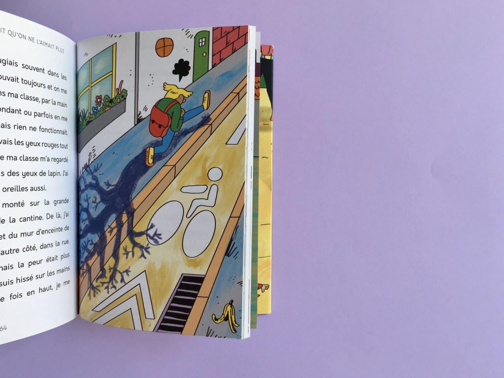 Ce roman fait partie de la nouvelle collection Le Grand Bain, lancée à la rentrée dernière aux éditions du Seuil jeunesse et proposant des romans illustrés pour les lecteurs à partir de 8 ans sous forme de beaux livres à la maquette réfléchie et qui attire l’oeil, réflexion intéressante pour amener à la lecture et passer en douceur des albums illustrés aux romans, l’un n’excluant bien sûr pas l’autre. Ainsi, les choix des auteurs et particulièrement des illustrateurs sont très pertinents et parfois audacieux dans ce secteur du roman en mettant en avant de vrais choix graphiques contemporains. La maquette et la présentation s’avèrent également très bien pensées et intéressantes avec une vraie harmonie entre textes et illustrations tous deux forts et des détails ayant leur importance comme de belles jaquettes américaines se dépliant en posters que l’on voudrait tous chez soi.