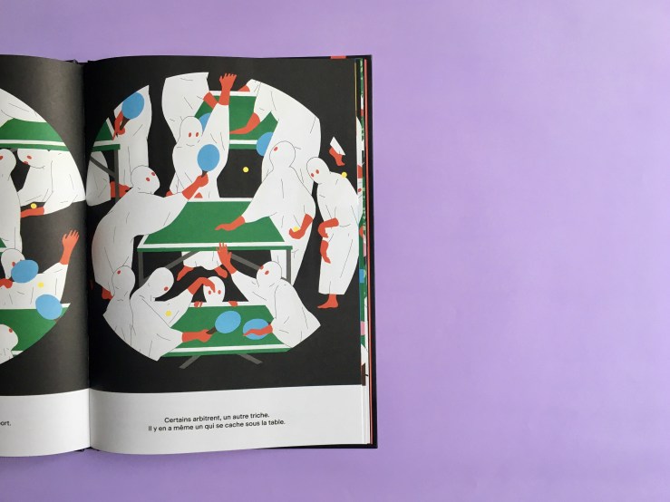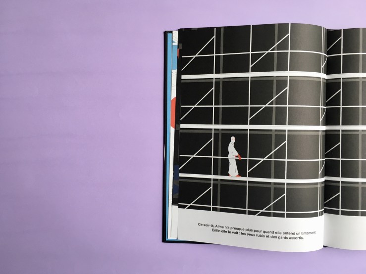 Le travail graphique de Laurie Agusti est très intéressant, développant l’univers de la ville et du chantier dans leurs dimensions visuelle, lumineuse et sonore permettant de montrer la ville, où vivent de nombreux enfants, et son aspect fascinant, grandiose mais quotidien. La ville est ici un lieu propice du jeu graphique de l’autrice autour de la régularité, du motif entre l’immeuble, les échafaudages, les tables ou même les fantômes eux-mêmes et leurs divers accessoires. Les illustrations d’une grande finesse à la gouache et au rotring peuvent à première vue être prises pour du numérique tant elles sont précises et régulières. Des touches de couleurs sont plus ou moins présentes selon les doubles pages et permettent de rendre les fantômes de plus en plus familiers, des inquiétants spectres aux yeux et gants rouges du début qui se trouvent petit à petit affublés d’accessoires colorés au fil de leurs activités. Un vrai rythme est donné à la narration par les illustrations dans une alternance de lumière, d’aplats noirs, de vide, de plein, de dense ou d’épuré. Cet univers étrange et d’un onirique inhabituel a un effet magnétique et saisissant visuellement sur le lecteur.