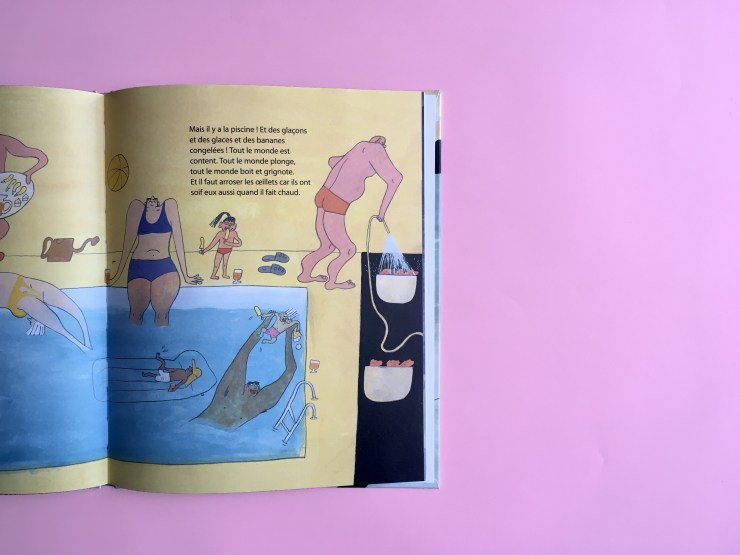 L’opposition entre la ville et la nature a priori simple s’avère dans cet album bien plus élaborée qu’il n’y paraît. Si le sujet de la sensibilisation à l’écologie est évident, il est aussi question d’un rapport historique et d’une inscription dans le temps de l’urbanisation de notre planète. Le temps semble ici condensé. Tout se passe sur une année avec les saisons qui défilent, les tracas qui y sont à chaque fois liés (que les feuilles tombent trop, qu’il n’y ait pas assez de neige, qu’il pleuve trop ou qu’il fasse trop chaud) et les actions des humains pour y remédier en tentant de circonscrire cette nature et ses effets. Voilà donc construite par l’autrice une boucle narrative sur cette année comme une suite de conséquences en chaîne vers le pire qui pourrait faire boule de neige d’année en année… Il y a là comme un récit condensé d’une urbanisation qui a pu en réalité prendre beaucoup plus de temps entre arbres abattus, goudronnage, déchets jetés dans le lac, climatisation et tant d’autres choses. En raccourcissant ce délai, les effets désastreux sur la nature sont d’autant plus visibles et palpables qu’ils sont immédiats, intenses et non dilués par le fil du temps et de l’habitude. Ce parti pris est intéressant pour permettre une réelle remise en cause et compréhension de certaines relations de causes à effets sur la nature.
