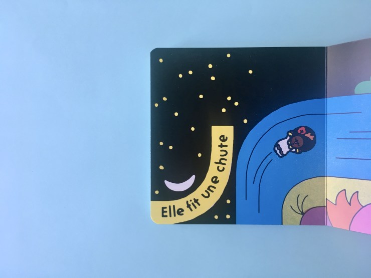 La forme du livre et sa mise en page soignée, notamment quant au texte, soulignent et concrétisent cette idée de mouvement. Le livre est d’un petit format carré cartonné très maniable dès un jeune âge, ce qui renforce vite l’effet jeu de l’album à manipuler dans tous les sens. Le texte est ici présenté dans des cartouches jaunes vifs suivant avec souplesse et dans tous les sens les mouvements fluides et les rouler-bouler de la petite fille. Par leur clarté, ces encarts jaunes prennent le sens de flèches à suivre invitant inconsciemment au mouvement dès le tourbillon du titre en couverture entourant la fillette aux yeux clos. Cela donne un livre que l’on manipule naturellement dans tous les sens pour le lire à l’enfant qui va alors pouvoir se l’approprier de cette façon, en le tournant et le retournant, imitant alors la trajectoire sinueuse de la petite fille. Voilà un livre à manipuler au mécanisme simple et visuel donnant beaucoup d’effet et d’humour à la lecture.