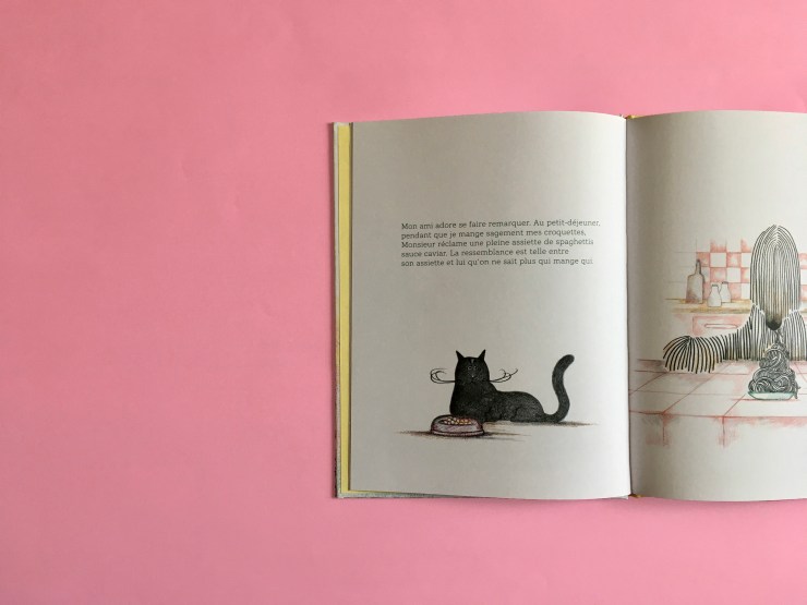 Après Olive et Léandre et Slip, voilà le troisième album réalisé ensemble par ces deux auteurs aux éditions Les Fourmis rouges. Nous sommes ici embarqués dans la vie d’Iggy, un lévrier afghan aussi grand que fort poilu, telle que racontée par son maître, Duc, un chat noir. Le portrait du chien nous est dressé par petites touches, comme autant de moments de son quotidien tous plus amusants les uns que les autres. C’est qu’il a ses habitudes, ses manies et obsessions qui le rendent très drôle et attachant. Chaque double-page présente un moment marquant, anodin ou cocasse dans la journée de l’animal, avec souvent le chat scrutateur, mi-attendri mi-amusé selon le ton du texte dont il est le narrateur participant. Si, par le jeu d’illustrations mis en place, l’œil du lecteur est attiré par le chien, le chat est presque toujours présent, alangui et égayé.
