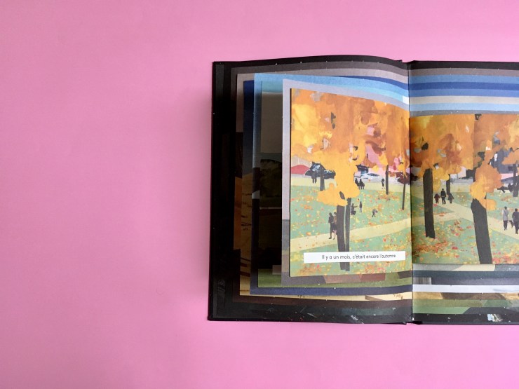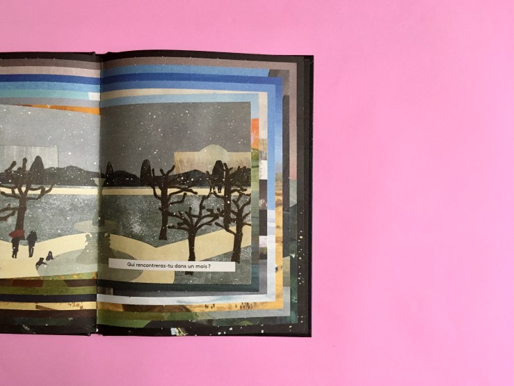 Le système théoriquement et visuellement simple des pages de plus en plus petites avec le temps qui passe donne, par cette pureté de la structure, un effet visuel fort et immédiatement compréhensible et palpable. Au fil des pages et du temps qui passe, les illustrations passées forment comme des cadres imbriqués, une présence non-représentative mais visible de ce qui nous a marqué. Par ce principe même et le jeu des valeurs de rétrécissement, en plus de devenir plus petites, les pages changent de format, partant d’un album classique pour arriver au centre à une sorte de petite carte à l’italienne, changeant les perspectives des paysages. Les illustrations sont faites de collages de différentes formes à la peinture donnant relief et profondeur mais aussi un réel effet de textures et de matières. La gamme de couleurs utilisée est plutôt douce, évoluant selon les moments du jour et de l’année avec quelques rehauts de couleurs vives par moment. Les illustrations représentent principalement des paysages ou atmosphères dans un effet de cartes postales assez saisissant. L’on est d’abord sans aucune présence humaine, puis celle-ci arrive tout en restant diffuse, les groupes de personnes n’étant pas déterminés et l’enfant-lecteur.ice auquel l’autrice s’adresse jamais représenté.e, laissant libre le champ de tous les possibles.