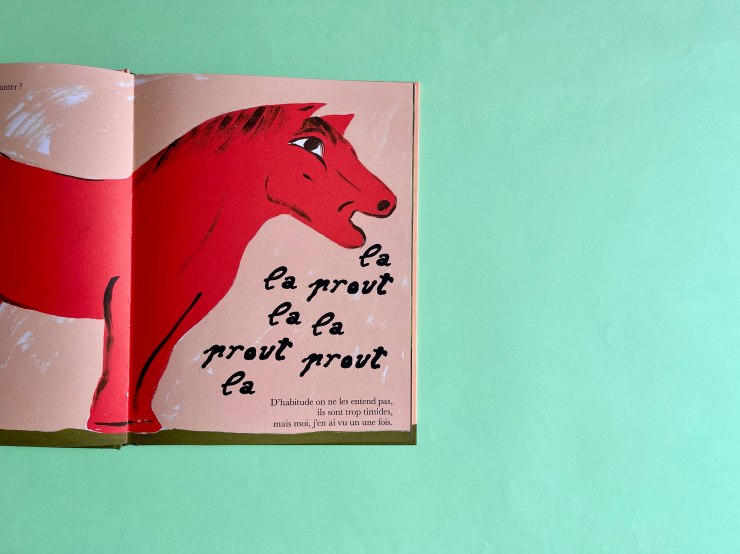 Ici, le narrateur hors champ, que l’on imagine enfant, nous questionne et nous raconte ce qu’il sait et pense que nous ignorons quant au chant des chevaux, à la course des maisons, aux embrassades des chaussures ou aux pleurs des gâteaux. Évitant la raideur de l’anaphore tout en en gardant le rythme et l’humour de répétition, est posée aux lecteur.ices, directement interpelé.es, une suite de questions, une par double-page, commençant par celle du titre, « Avez-vous déjà entendu un cheval chanter ? », donnant le ton et le modèle sur une première double-page. Suit une illustration de l’animal ou de la chose en action accompagnée d’onomatopées utilisant une typographie manuscrite à la peinture s’intégrant dans l’illustration pour expliciter le bruit créé par cette action. Enfin, en bas à droite de la double-page vient un petit texte rassurant expliquant pourquoi nous n’avons, nous, jamais, ni vu, ni entendu ces activités incongrues.