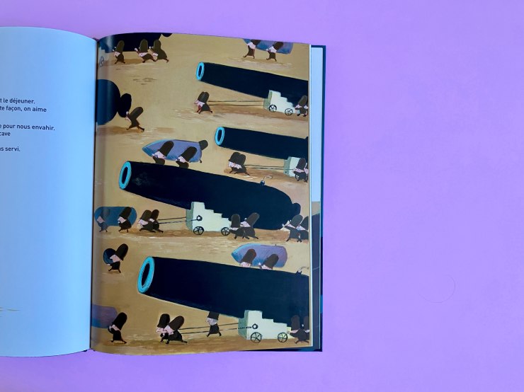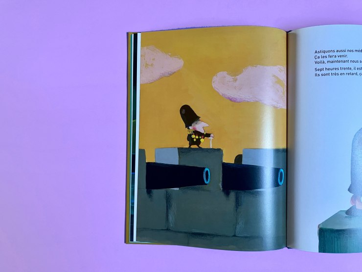 Voilà une bien drôle de guerre à laquelle se préparent tous les petits personnages très raides et interchangeables en uniforme noir coiffés de grands chapeaux rappelant, démultipliés, Les Trois Brigands de Tomi Ungerer. L’humour naît de l’absurde et du décalage de la situation. Il semble que, dans cette ville fortifiée bien moderne dans ses bâtiments quoique pourvue d’une muraille médiévale, l’on vive en paix depuis longtemps. En effet, les préparatifs commencent par le fait de nettoyer les canons poussiéreux et visiblement fort peu utilisés jusqu’à celui d’astiquer les médailles. L’on est alors aussi amusé.es qu’interpellé.es par l’incongruité d’une attente qui semble de plus en plus vaine de ces petits personnages scrutant l’horizon, ne sachant pas vraiment qui ils attendent, à quel moment ni par où ils vont arriver, ni même s’ils finiront bien par arriver.