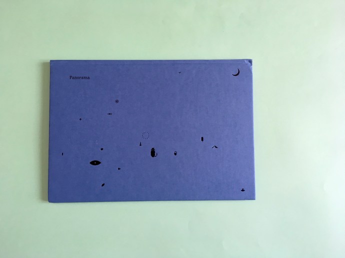 oilà un album intriguant dès sa couverture bleue où se distinguent seulement divers détails en dorure noire plus ou moins reconnaissables. Puis, l’on ouvre le livre et apparaît sur chaque page du bas une suite de vingt-quatre fois le même paysage représentant une maison dont la grande fenêtre laisse deviner l’intérieur, son jardin et la nature environnante selon les variations des heures du jour et de la nuit.